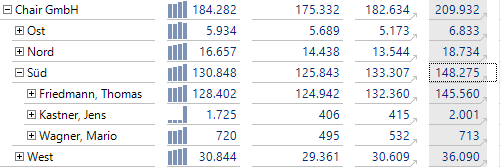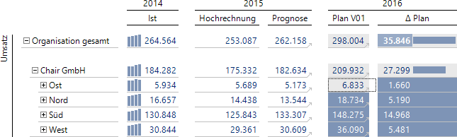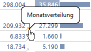 Auch die kleinen grauen Pfeile oder geriffelten Symbole in den Zellen oder Zeilenüberschriften sind vom Reporting her bekannt. Sie weisen auf Verknüpfungen hin, mit denen man in einen anderen Bericht verzweigen kann, meist: eine Detailansicht, zum Beispiel von Jahreswerten zur Monatsverteilung.