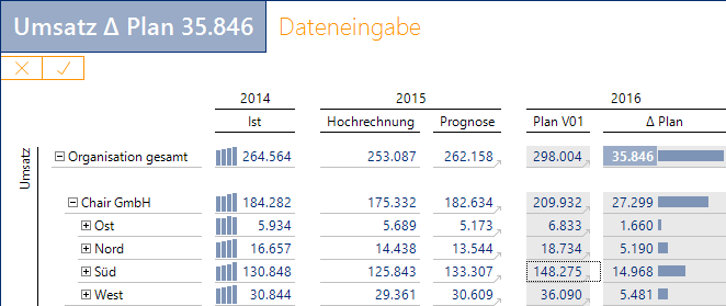 Bei Eingaben in Hierarchien achtet DeltaMaster darauf, dass die Summen immer stimmen. So werden nach einer Eingabe die Werte der in der Hierarchie über- und untergeordneten Elemente automatisch angepasst: Nach oben (bottom-up) aktualisieren sich die aggregierten Elemente, nach unten (top-down) wird die Wertänderung automatisch proportional verteilt, sodass sie in Summe den neuen Wert ergeben und die Wertverhältnisse gleich bleiben. Dieses Umlegen nennt man auch Splashing. Es läuft vollautomatisch ab; als Anwender müssen Sie sich nicht darum kümmern.