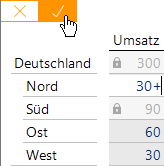Im Bericht werden fixierte Zellen mit einem Schloss-Symbol angezeigt. Ein graues Schloss kennzeichnet eine Fixierung, die der Anwender bei der Dateneingabe (im Präsentationsmodus) setzen und aufheben kann, zum Beispiel, um Planwerte auf verschiedene Kunden zu verteilen, ohne die Summe zu ändern. Ein schwarzes Schloss steht für eine Fixierung, die sich nur im Bearbeitungsmodus setzen und aufheben lässt; die Wirkung ist die gleiche.