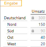 Im Beispiel wird in der Region Nord eine Erhöhung geplant, die Summe für Deutschland ist jedoch fixiert ist. Deshalb muss es in anderen Regionen eine Verminderung geben, eine davon, Süd, ist jedoch ebenfalls fixiert. Daher legt DeltaMaster die Änderung auf die Regionen Ost und West um, wie in der folgenden Tabelle aufgeschlüsselt.