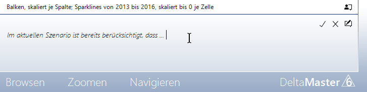 Zum Übernehmen bzw. Verwerfen der Eingabe dienen die zwei kleinen Symbole im Eingabebereich. Berichtskommentare werden mit Bezug auf die jeweiligen Filtereinstellungen (die aktuelle Sicht) zentral in einer Datenbank gespeichert. So können für denselben Bericht unterschiedliche Kommentare für unterschiedliche Monate, Szenarios, Planversionen, Kundengruppen usw. erfasst werden.