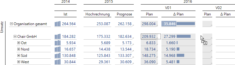 Im Beispiel wird eine ganze Wertstruktur von einer Planversion auf eine zweite, noch leere Version gezogen. Auf diese Weise lässt sich die zweite Version sehr schnell mit Werten vorbelegen. Würde man hingegen lediglich die Summe als Wert eingetragen bzw. kopieren und einfügen, so müsste DeltaMaster diesen Wert gleichmäßig auf alle untergeordneten Zellen verteilen, wodurch in der Regel eine unrealistische Wertverteilung entsteht (und viel Rechenzeit verbraucht wird).