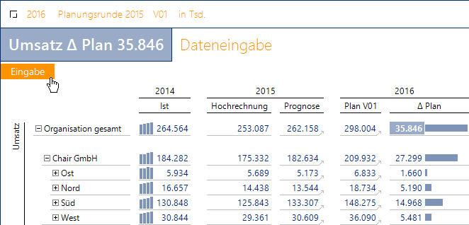 Zur Planung arbeitet man in DeltaMaster mit Grafischen Tabellen (Pivottabellen), im selben Format also, das sich auch im Reporting und bei Analysen so bewährt und von daher vertraut ist. Eine Eingabemaske ist mit DeltaMaster nichts anderes als ein Bericht, in den der Anwender Werte eintragen kann – mit dem Windows-Client, im Webbrowser oder mit der App für das iPhone/iPad. Die Möglichkeit, gerade Planungsanwendungen über das Web bereitzustellen, wird gerne genutzt: An Planungsrunden sind oft auch Mitarbeiter beteiligt, die noch nicht interaktiv mit DeltaMaster arbeiten, sondern ihre Berichte zum Beispiel per E-Mail oder als PDF-Datei in einem Benutzerverzeichnis bekommen. Über das Web können diese Anwender einbezogen werden, ohne ihnen ein Programm zu installieren – der Link zur Planungsanwendung genügt und das Eingeben kann beginnen.