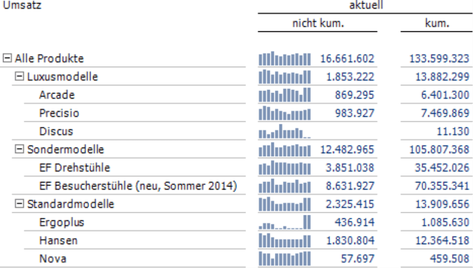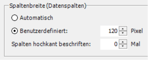 - Datenspalten sind die Spalten, in denen die Zahlenwerte ausgegeben werden. Die benutzerdefinierte Breite (in Pixel) gilt für alle Datenspalten. Sie ist ein Minimalwert: Jede Spalte wird mindestens so breit, wie es die Daten erfordern. Es kann also nicht passieren, dass die Zahlen, die Sparklines oder andere Zellelemente „abgeschnitten“ werden. Auch wird der Inhalt der Datenzellen nicht umgebrochen. Anders verhält es sich mit den Überschriften der Datenspalten: Diese werden gegebenenfalls automatisch umgebrochen, sodass eine lange Überschrift nicht zu einer Verbreiterung der Spalte führt.