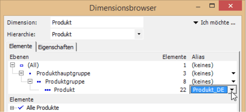 - Aliasse für Dimensionselemente auswählen (Dimensionsbrowser)