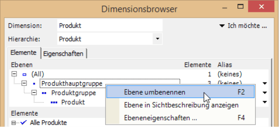 - Ebenfalls im Dimensionsbrowser lassen sich Ebenen und Hierarchien umbenennen, erstere über ihr Kontextmenü, letztere über das Menü Ich möchte.