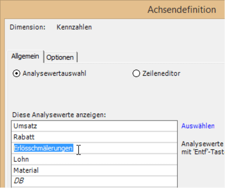 - individuelle Bezeichnungen in der Achsendefinition eintragen (Elementauswahl, Zeilen- oder Spalteneditor)