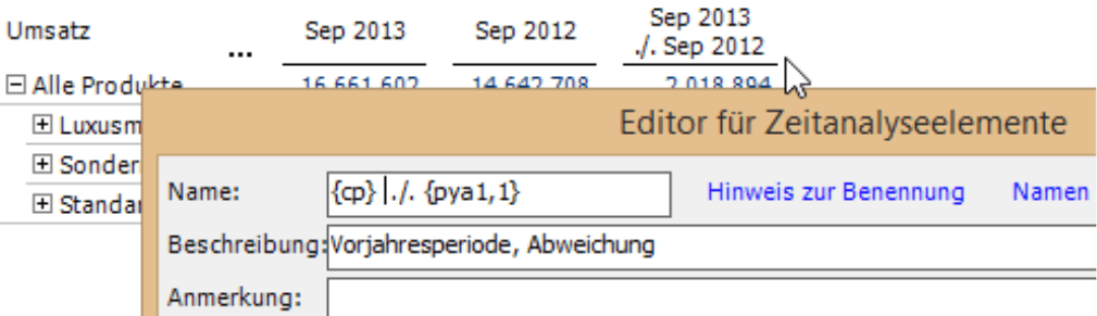 In der Achsendefinition der Pivottabelle können Sie die Bezeichnungen aus der Datenbank für den aktuellen Bericht „überschreiben“, vorausgesetzt, es handelt sich um eine Element- bzw. Analysewertauswahl oder um eine Kombination, die mit dem Zeilen– oder Spalteneditor definiert ist. In diesen Fällen können Sie die Elemente mit der Taste F2 bearbeiten (bei der Elementauswahl alternativ auch nach einem Doppelklick). Einzelheiten finden Sie in den DeltaMaster deltas! 5.5.5, Punkt 12 und 13.
