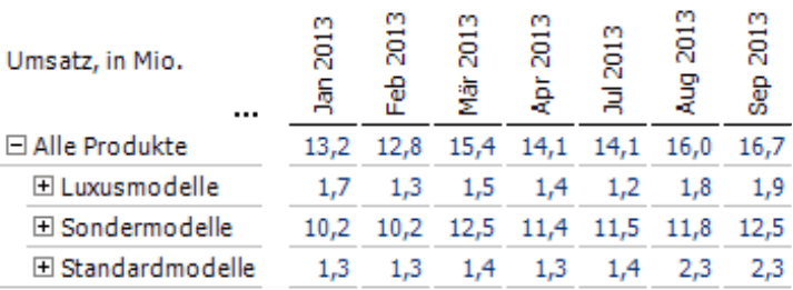 Wie dicht eine Tabelle erscheint, hängt wesentlich von der Beschriftung der Spalten und Zeilen ab. Sofern nichts anderes festgelegt ist, wird jeder Tabellenspalte so viel Breite zugestanden, wie nötig ist, um den längsten Text dieser Spalte vollständig unterbringen zu können. Damit genügt eine einzige lange Bezeichnung, um eine Spalte in die Breite zu drücken. Manchmal stört das: Die Spalte verschlingt viel Platz, den man lieber für zusätzliche Information nutzen würde; zwischen den kurzen Beschriftungen und den zugehörigen Zahlen entsteht ein großer Abstand, den das Auge überwinden muss; und womöglich wird die Tabelle insgesamt so breit, dass sie nicht mehr auf den Bildschirm passt und gescrollt werden muss. Oft genug macht eine übergenaue Beschriftung die Lage nicht einmal klarer: Im Controlling sind wir zufrieden, wenn wir in der Bilanz die „Grundstücke“ finden; dass daraus im Jahresabschluss „Grundstücke, grundstücksgleiche Rechte und Bauten einschließlich der Bauten auf fremden Grundstücken“ werden, ist für die meisten operativen und strategischen Entscheidungen irrelevant. Was also tun, wenn die Namen von Dimensionselementen, Analysewerten und Ähnlichem zu lang sind? Oder, allgemeiner: Was tun, wenn sich die Bezeichnungen, die wir aus den Vorsystemen bekommen, nicht für ansprechende Berichte eignen?