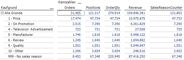 - In der Bridge-MeasureGroup (hier: Kaufgründe) werden zusätzlich die Elementkombinationen ohne Nennung gezählt.