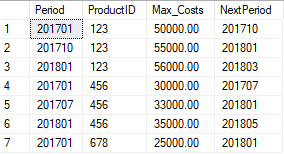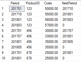 WITH CTE (Periode, ProductID, Costs, Next_Periode)