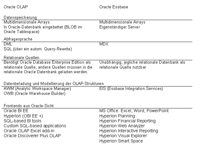 Zusammenfassend bietet die folgende Tabelle einen Überblick über die diskutierten technischen Unterschiede zwischen Oracle OLAP Option und Oracle Essbase:
