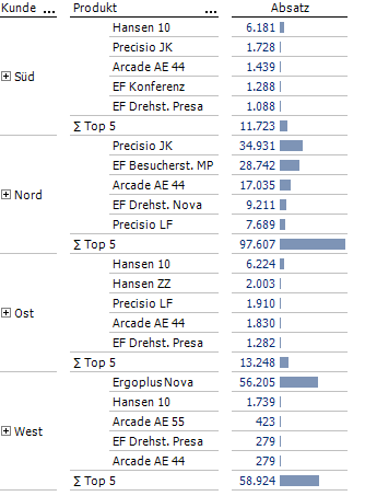 Bleiben wir zunächst gerne bei unserem Beispiel. Zu erstellen ist ein Bericht für die Chair AG. Auf die Zeilenachse gehören die vier Kundenregionen Nord, Süd, Ost und West, sowie deren jeweils Top 5 verkauften Produkte. Spätestens nach zwei intensiven Tagen Umgang mit DeltaMaster in unseren Schulungsräumlichkeiten beantworten wir eine solche Anforderung fix mit einem solchen Bericht: