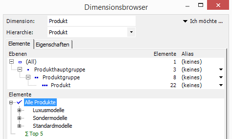 Häufig geht der Blick hierbei erneut in die Definition der Achse, und zwar genauer gesagt in die Auswahl der angezeigten Produkte. Hier ist es erlaubt, neben der Auswahl der untersten Ebene der Hierarchie (Produkt) auch einen darüber liegenden Knotenpunkt auszuwählen, z. B. das allen übergeordnete Summenelement (All).
