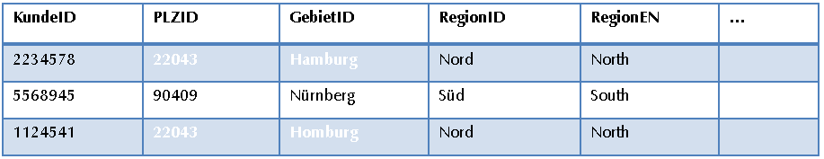 Werden alle vier Tabellen der Dimension in einer flachen, nicht normalisierten Tabelle gepflegt und wird aus dieser Tabelle das Snowflake-Schema aus Abbildung 1 befüllt, kann es sehr leicht zu Fehlern kommen. So auch in dem Beispiel aus Abbildung 2. Die PLZID 22043 kann aufgrund des Primärschlüssels in der Tabelle T_DIM_05_03_PLZ nur einmal angelegt werden, es gibt jedoch zwei Verweise, einen auf Hamburg und einen auf Homburg. Der Kunde würde nun möglicherweise den Schlüsseldienst rufen, der ihm seinen Tippfehler in der Pflege aufzeigt.