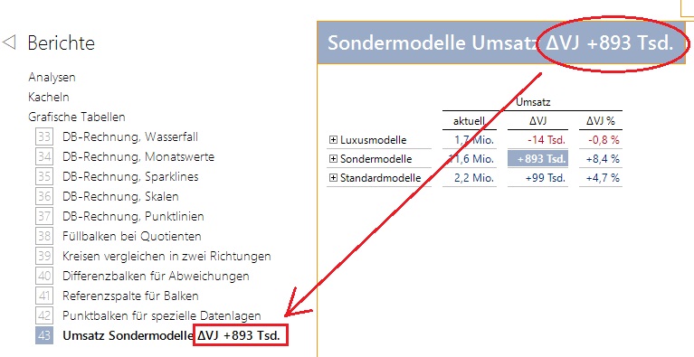Die Bausteine, die man für die Darstellung der Kennzahl in der Wetterzelle benötigt, sind das Vorzeichen, die Kennzahl selbst und die verkürzte Schreibweise in Tausender bzw. Millionen (Tsd., Mio.). Die Sondermodelle könnte man variabel mit in die Überschrift nehmen, da sich der Bezug von Wetterzellen aber nicht ändert, wären dies umsonst getippte Zeichen.