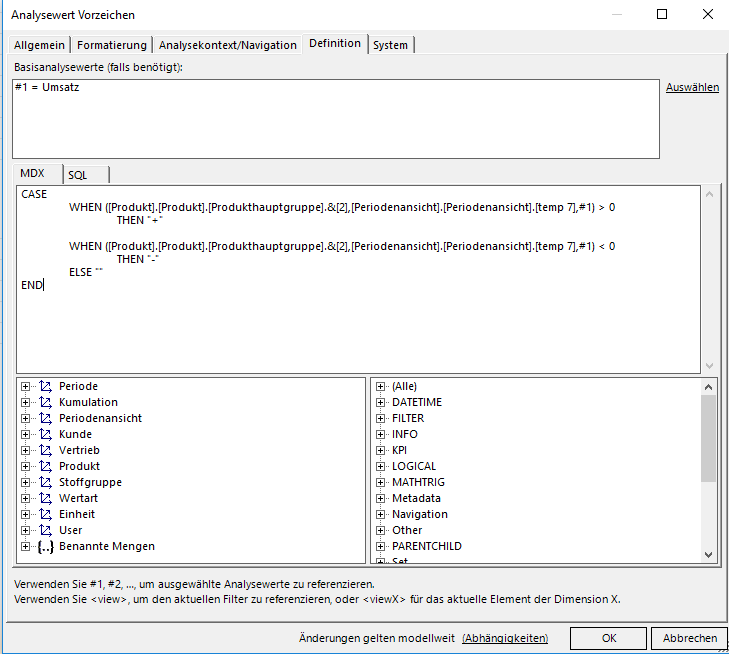 Die zweite Kennzahl ist das Kürzel für Ergebnisse, die größer als 1.000 bzw. größer als 1.000.000 sind. Der MDX-Code ist recht unübersichtlich, weswegen er einfach hier in abgekürzter Textform eingefügt wird. Die Kennzahl muss hierbei lediglich auf den Wert geprüft und das Ergebnis entsprechend durch „Tsd.“ oder „Mio.“ ersetzt werden. Das Gewünschte erreicht man zum Beispiel mit: