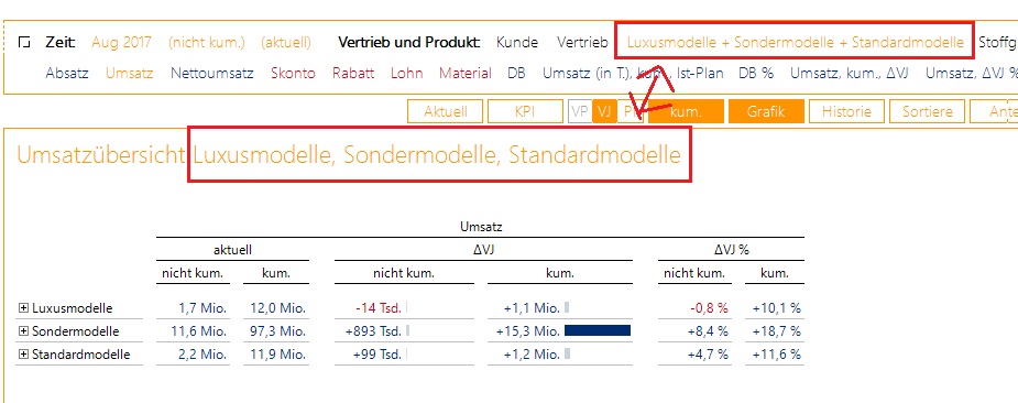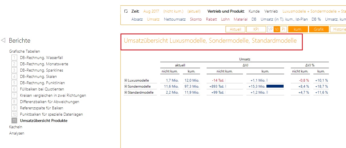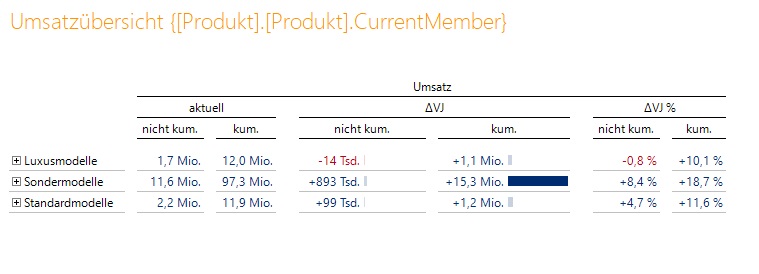 Im Beispiel sehen wir in der Berichtsübersicht den Titel „Umsatzübersicht Produkte“. Bearbeitet man nun den Berichtstitel im Bericht selbst und ersetzt „Produkte“ durch eine „<viewX>“-Referenz, so sieht man im Bericht den gesetzten Filter in der Dimension „Produkte“, hier also Luxusmodelle, Sondermodelle und Standardmodelle. In der Berichtsübersicht bleibt der ursprüngliche Titel „Umsatzbericht Produkte“ erhalten. Beide Titel lassen sich nun unabhängig voneinander bearbeiten.