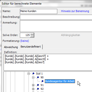 DeltaMaster erlaubt es dem Anwender ab der Benutzerstufe Pivotizer, berechnete Elemente anzulegen. Sollen beispielsweise mehrere Kunden aus unterschiedlichen Regionen in mehreren Auswertungen zu einer Summe zusammengefasst werden, reicht die Definition eines berechneten Elements („Calculated Member“) im Dimensionsbrowser: