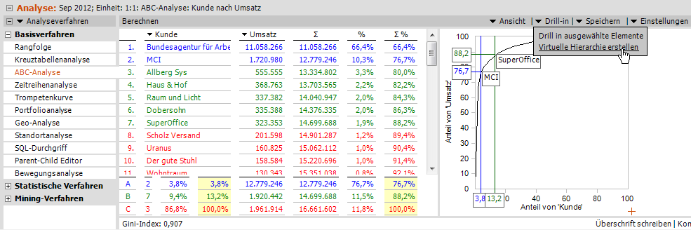Nach Ausführung der jeweiligen Analyse kann das Ergebnis als „virtuelle Hierarchie“ in die Dimension zurückgeschrieben werden und bleibt in der Analysesitzung bzw. Anwendung im Repository erhalten.