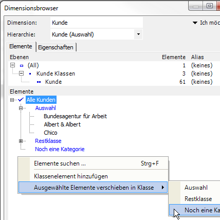 Völlig freie, von statisch oder dynamisch definierten Merkmalen unabhängige Klassifikationen sind durch einfache Multiselektion von Elementen einer Dimensionsebene im Dimensionsbrowser möglich. Im ersten Schritt entstehen zwei Klassen, „Auswahl“ und „Restklasse“. Nachträglich können mit Hilfe des Kontextmenüs beliebig viele zusätzliche Klassen erstellt und Elemente zwischen den Klassen verschoben werden.
