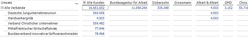 Der Kunde „Albert & Albert“ ist unter zwei Verbänden sichtbar, die Summe aller Verbände zählt den Umsatz des Kunden von 4.503 EUR jedoch nicht zweimal. Die Umsatzsumme aller Verbände von 16.661.602 EUR ist nicht die Summe der darunter angezeigten Verbände, da nicht alle Kunden Verbänden zugeordnet sind.