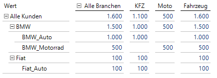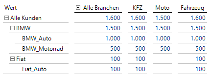 Zwischen den Dimensionen Kunde und Branche besteht eine m:n-Beziehung. Man erkennt zum Beispiel, dass die Verkaufsorganisation BMW_Auto in die beiden Branchen KFZ und Fahrzeug eingeordnet wurde. Der aggregierte Umsatz über ‚Alle Branchen‘ liegt für diese Verkaufsorganisation trotzdem bei 1000.