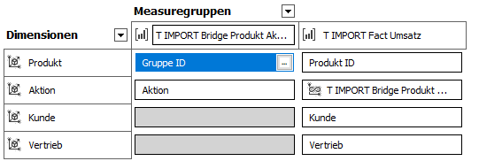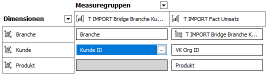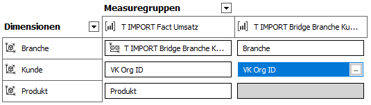 Es wurde eine sogenannte Hilfs-Measuregruppe oder Bridge verwendet, um die beiden Dimensionen Kunde und Branche miteinander zu verknüpfen. Das Granularitätsattribut ist hierbei die Verkaufsorganisation, also die unterste Ebene der Kunden-Hierarchie.