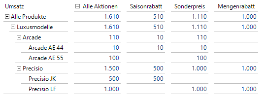 Betrachtet man beispielsweise die Produktgruppe Precisio erkennt man, dass im zweiten Fall – also bei Verwendung der Produktgruppe als Granularitätsattribut – nicht zugeordnet werden kann, welches Produkt der Produktgruppe mit welcher Aktion angeboten wird. Man sieht auch, dass die neue Aggregation für die nächste Hierarchieebene übernommen und damit weitergerechnet wird.