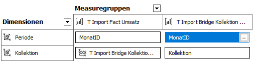 Das gleiche Vorgehen kann auch angewendet werden, wenn eine m:n-Beziehung zur Zeitdimension vorliegt. Hier wird das Beispiel von Mode-Kollektionen genutzt. Eine Kollektion wird mehrere Monate im Jahr verkauft. Kollektionen können sich auch überlappen, das heißt in einem Monat können mehrere Kollektionen angeboten werden.