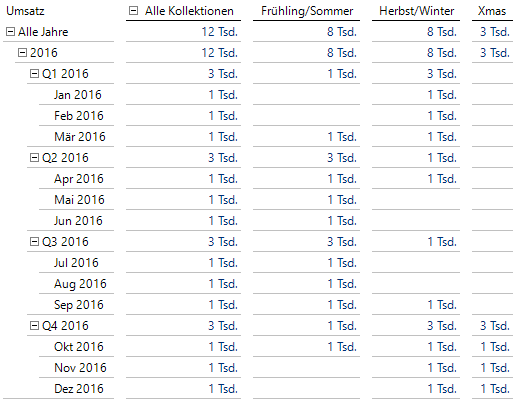 Wie erwartet, kann auch hier nicht mehr zugeordnet werden, in welchen Monaten genau eine Kollektion angeboten wird, sobald sie in mindestens einem Monat eines bestimmten Quartals zur Verfügung steht. Obwohl die Frühling/Sommer-Kollektion im vierten Quartal nur im Oktober verfügbar ist, kann dies durch die Anbindung auf Quartalsebene nicht mehr nachvollzogen werden.