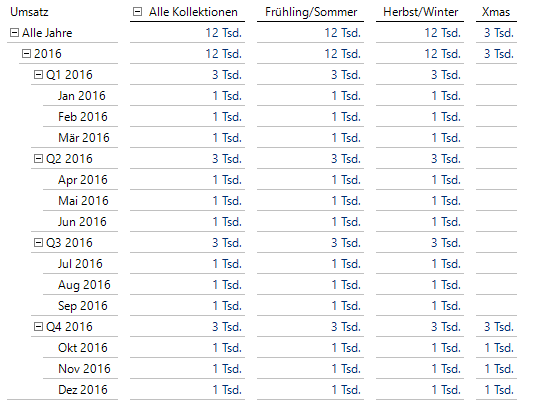 Man sieht zum Beispiel, dass im Monat September 2016 insgesamt ein Umsatz von 1000 generiert wurde, wobei in diesem Monat sowohl die Frühling/Sommer- als auch die Herbst/Winter-Kollektion, nicht aber die Xmas-Kollektion angeboten wird.