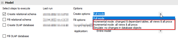 Für kleinere Modellanpassungen ist die inkrementelle Aufbereitung inklusive Tabellen („Incremental mode: changed & dependant tables, all views & all procs“) in den meisten Fällen der Standard. Hierbei werden sowohl die betroffenen Tabellen im Data Mart (T_DIM_* und T_FACT_*) als auch die zugehörigen Befüllungsprozeduren (P_DIM_* und P_FACT_*) neu erstellt sowie weitere virtuelle Objekte wie beispielsweise Views. Für den Anwender ist es hier nicht möglich, relevante Objekte für die Modellanpassung zu vergessen. Somit ist diese Methode der sicherste Weg der inkrementellen Modellaufbereitung. Gleichzeitig kann aber auch mehr neu erstellt werden als notwendig, was zu unnötigen Befüllungszeiten führt (dies wird im nächsten Abschnitt genauer erläutert).