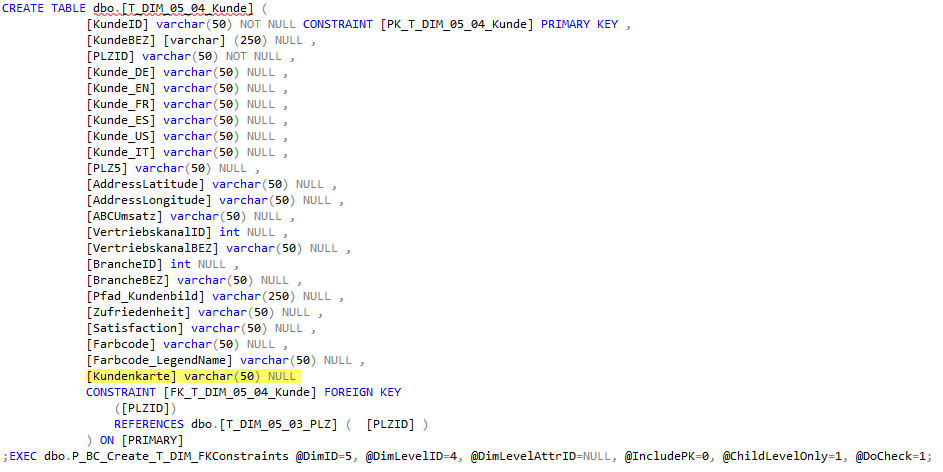 Das neu hinzugefügte Attribut ist in diesem Befehl erwartungsgemäß vorhanden (gelb markiert). Um nun ein Löschen der Dimensionstabelle zu vermeiden, verwenden wir die generierte Tabellendefinition, um einen ALTER-TABLE-Befehl zu erstellen (der beibehaltene Teil ist gelb markiert):