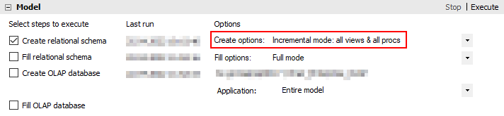 Bei der Aufbereitung von virtuellen Objekten („Incremental mode: all views & all procs“) werden lediglich Sichten und Befüllungsprozeduren neu erstellt. Diese Variante ist für Szenarios gedacht, in denen die Tabellen im Data Mart bereits die Struktur aufweisen, die im Metamodell definiert ist. Werden im Metamodell beispielsweise nur die Quellspalten für Dimensionen oder Faktentabellen geändert, hat dies keine Auswirkung auf die Zieltabellen im Data Mart – lediglich die Befüllungsprozeduren benötigen eine Aktualisierung. Diese Methode kann auch nach manuellen Anpassungen in den Data-Mart-Tabellen verwendet werden, um die virtuellen Objekte anzugleichen.