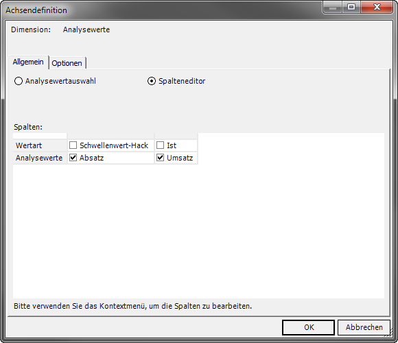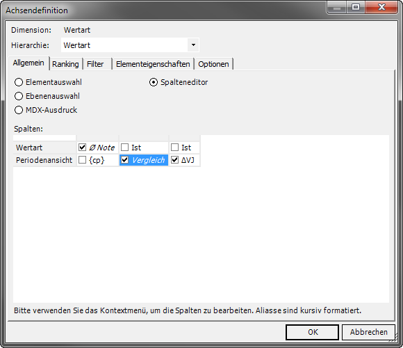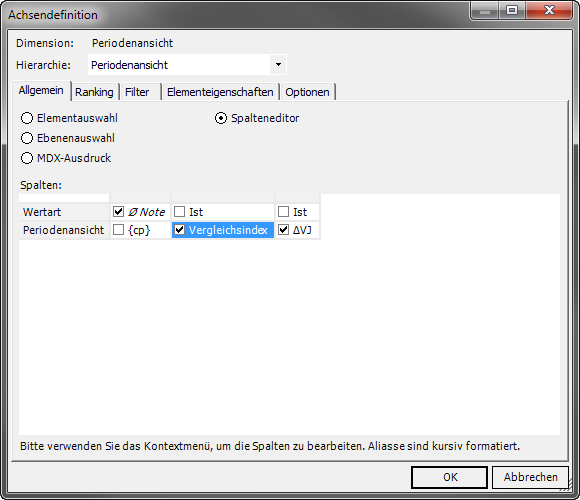 Abb. 9: Spalteneditorkonfiguration inklusive Hilfsdimension für Spaltenbenennung über Alias (Ø Note)