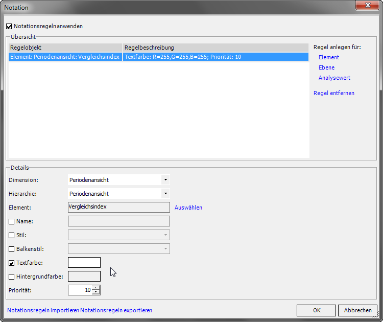 Der Text kann ausgeblendet werden, indem man eine Notationsregel anlegt, die besagt, dass der Text für das Element „Vergleichsindex“ weiß ist.