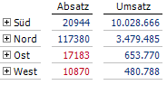 Für die vier Vertriebsregionen unserer Chair-Demo sollen die Analysewerte Absatz und Umsatz angezeigt werden. Dabei sollen die Werte für den Absatz unter 20.000 Stück rot eingefärbt werden. Für einen Absatz ab 20.000 Stück soll die Pivottabelle blaue Werte anzeigen.