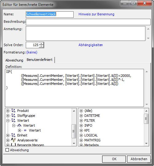 Der MDX-Code bedeutet folgendes: Wenn der aktuelle Analysewert kleiner als 20.000 ist, dann multipliziere ihn mit -1, ansonsten behalte die Measure unverändert bei.