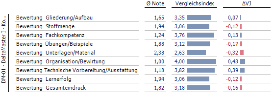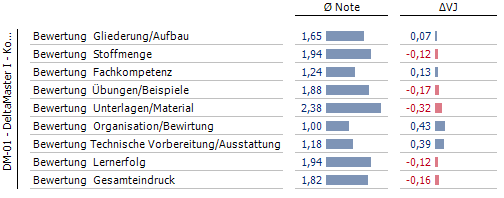 Unsere Campus-Veranstaltungen werden von den Teilnehmern nach jeder Schulung bewertet. Dabei werden für einzelne Kriterien Schulnoten von 1 (sehr gut) bis 5 (mangelhaft) vergeben. Diese Ergebnisse stellen wir selbstverständlich mit DeltaMaster-Berichten dar. In diesem Kontext ergab sich für uns eine knifflige Fragestellung: Wie kann man Notendurchschnitte anhand von Balken vergleichen? Denn das Problem ist: Ein schlechterer Notendurchschnitt hat einen längeren Balken als ein besserer. Allerdings ist das grundlegende Verständnis unserer Balken folgendes: Je länger ein blauer Balken, desto besser ist er.