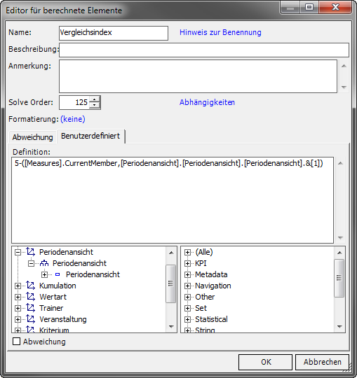 Um vergleichbare Balken anzuzeigen, empfiehlt es sich einen Vergleichsindex zu erstellen. Hierzu muss ein berechnetes Element angelegt werden (hier: Dimension Periodenansicht).