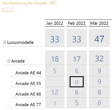 In der Eingabeanwendung können auf beliebigen Ebenen Daten eingegeben werden. Wir bleiben in dem Beispiel bei Kunde, Monat und Produkt/Produktgruppe.