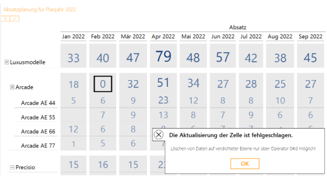 Wir definieren einen neuen Custom Operator „0#d“ zum expliziten Löschen von Werten auf aggregierten Ebenen. Auf Basisebene lassen wir nach wie vor die Eingabe von „0“ zu.