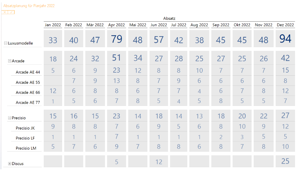 In diesem Artikel behandeln wir ein Beispiel mit 12 Monaten, 22 Produkten und 61 Kunden – und damit gut 16.000 möglichen Kombinationen. Natürlich kauft nicht jeder Kunde in jedem Monat alle Produkte, aber eine systemische Unterstützung für sinnvolle Kombinationen und realistische Verteilung von höheren Ebenen ist unbedingt notwendig.