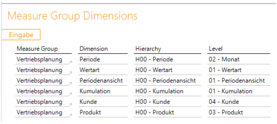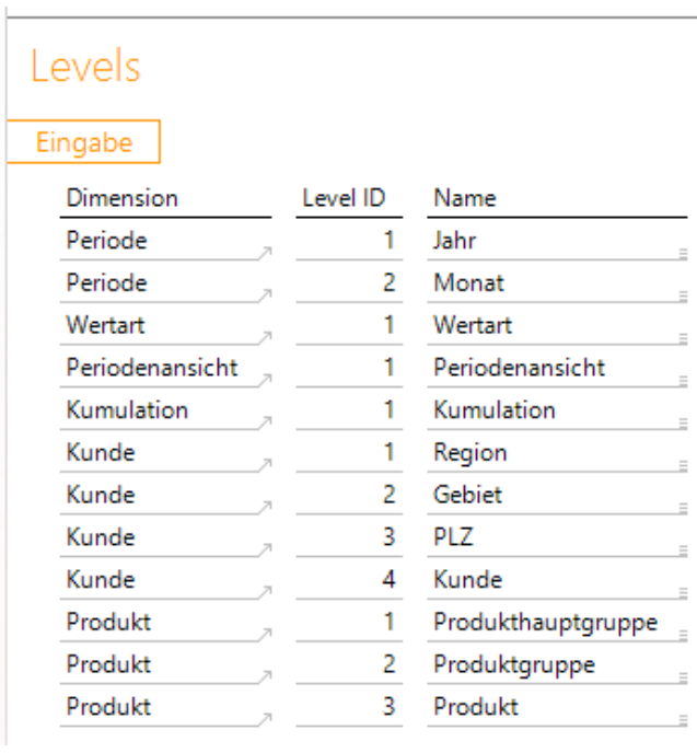 Die Dimensionen haben mehrere Ebenen (Level). Um die Planung zu vereinfachen, wird zunächst nur der Monatswert pro Kunde auf der Ebene Produktgruppe eingegeben.