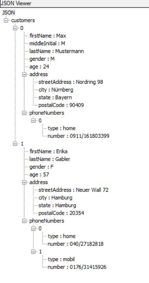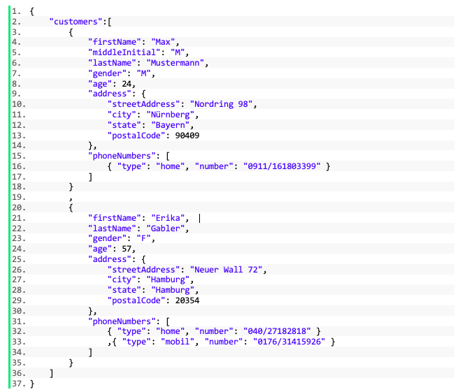 In diesem Beispiel gibt es ein Objekt, das aus einem Array namens „customers“ mit zwei Einträgen besteht. Innerhalb dieser Einträge können weitere Objekte und Arrays verschachtelt werden. Hier ist das Objekt „address“ und das Array „phoneNumbers“ unter dem Arrayeintrag verschachtelt.