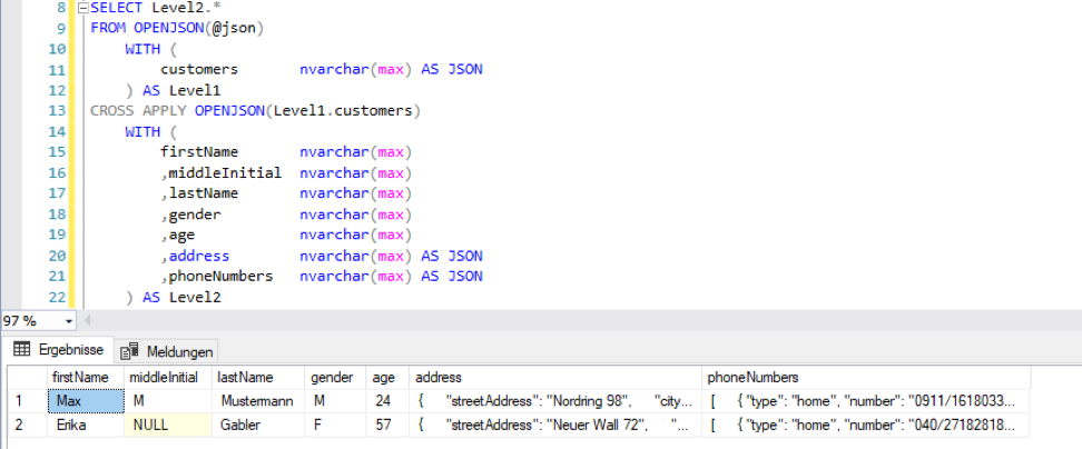 Abbildung 6: OPENJSON für geschachtelte Ebene