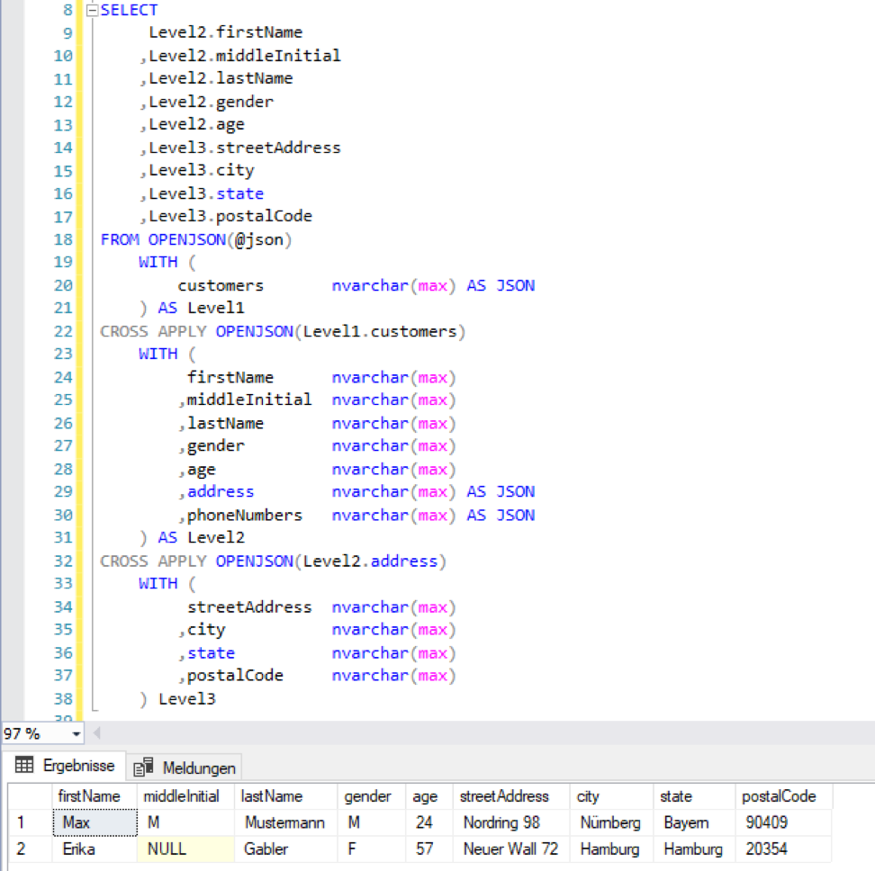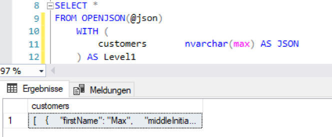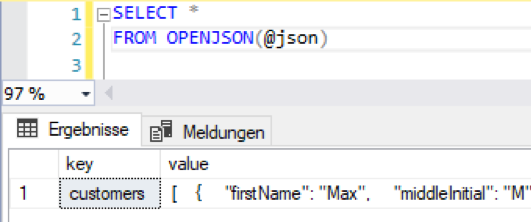 Zum Parsen der Struktur wird im Anschluss die Funktion OPENJSON verwendet: