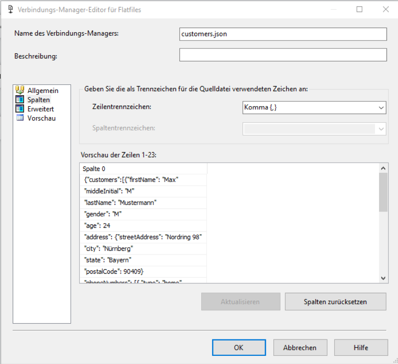 Eine andere Möglichkeit ist, mit Hilfe von SSIS die OPENROWSET-Funktion zu umgehen. Die Idee ist, den String komplett in den SQL Server zu importieren und im Anschluss die OPENJSON-Funktion zu benutzen. Hierfür wird eine Import-Tabelle mit einer Spalte des Typen (n)varchar(max) benötigt. SSIS lässt keine längeren Zeichenketten als 8000 (für varchar) bzw. 4000 (für nvarchar) zu. Daher muss unabhängig von der Formatierung der JSON-Datei, der Inhalt in mehrere Zeilen geschrieben werden. Dies gelingt im SSIS-Verbindungsmanager für Flatfiles, indem kein Spaltentrennzeichen, aber ein Zeilentrennzeichen, welches mindestens alle 8000 bzw. 4000 Zeichen vorkommt (z.B. Komma), angegeben wird: