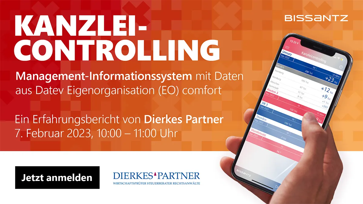 Im Webinar stellen wir unsere Lösung für das Kanzlei-Controlling vor und präsentieren Ihnen einen Erfahrungsbericht aus erster Hand: von Dierkes Partner aus Hamburg.